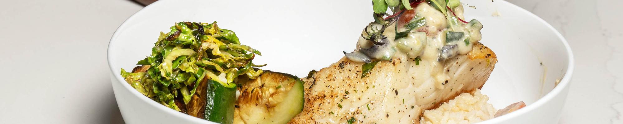 Infused Herbed Pan Seared Sea Bass / Kalamata, Tomato, Scallion, and Zucchini White Wine Sauce / Hummus Puree / Basmati Pilaf / Split Zucchini and Shaved Brussels